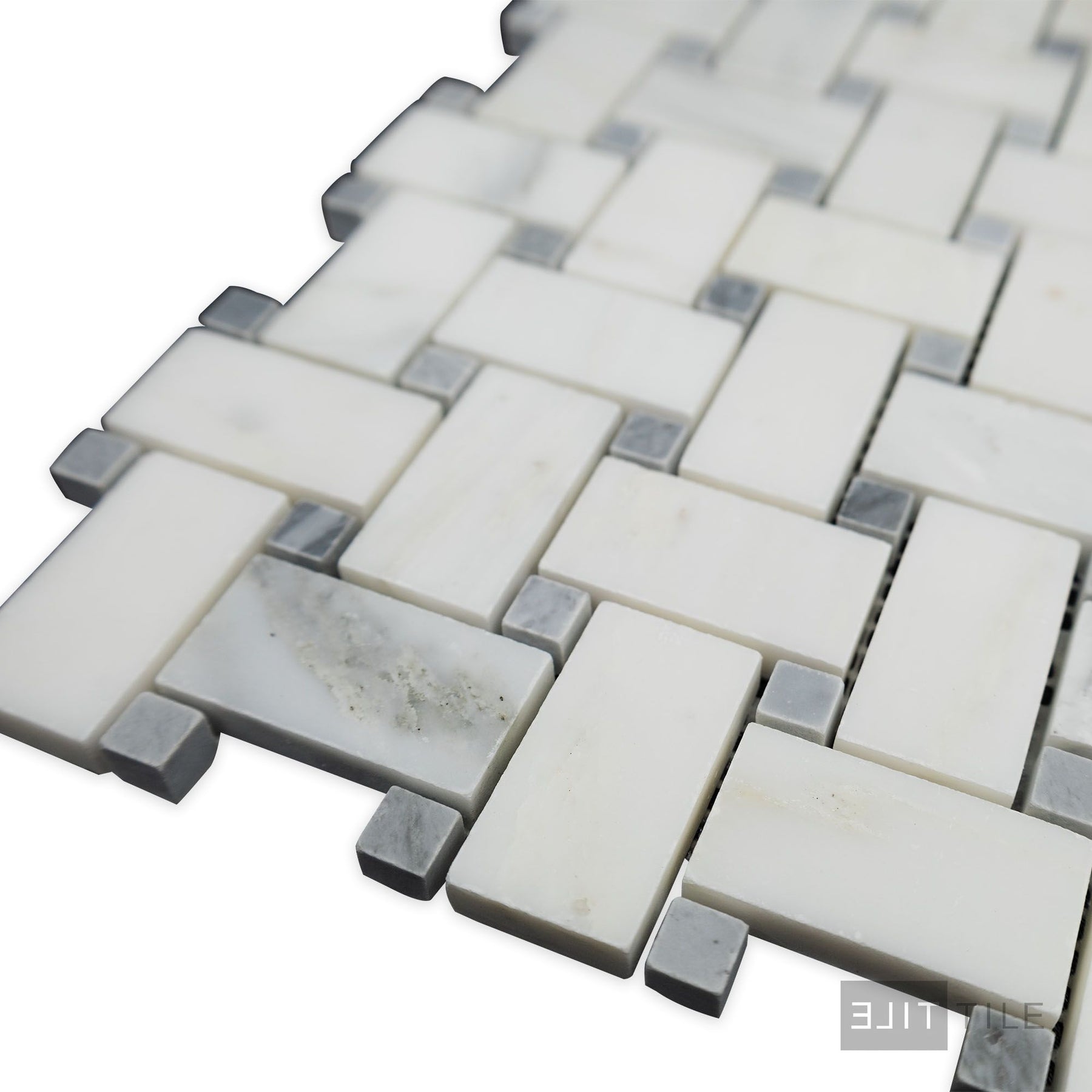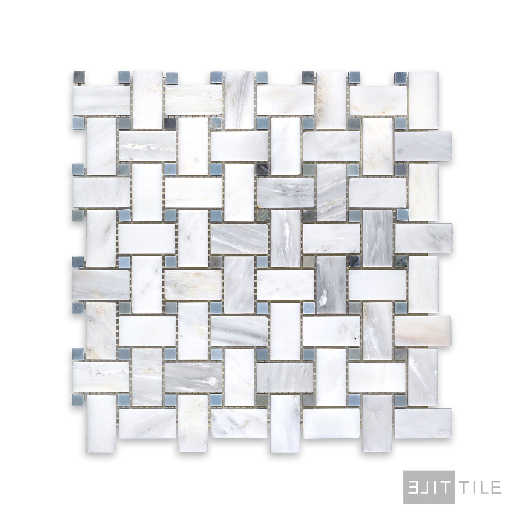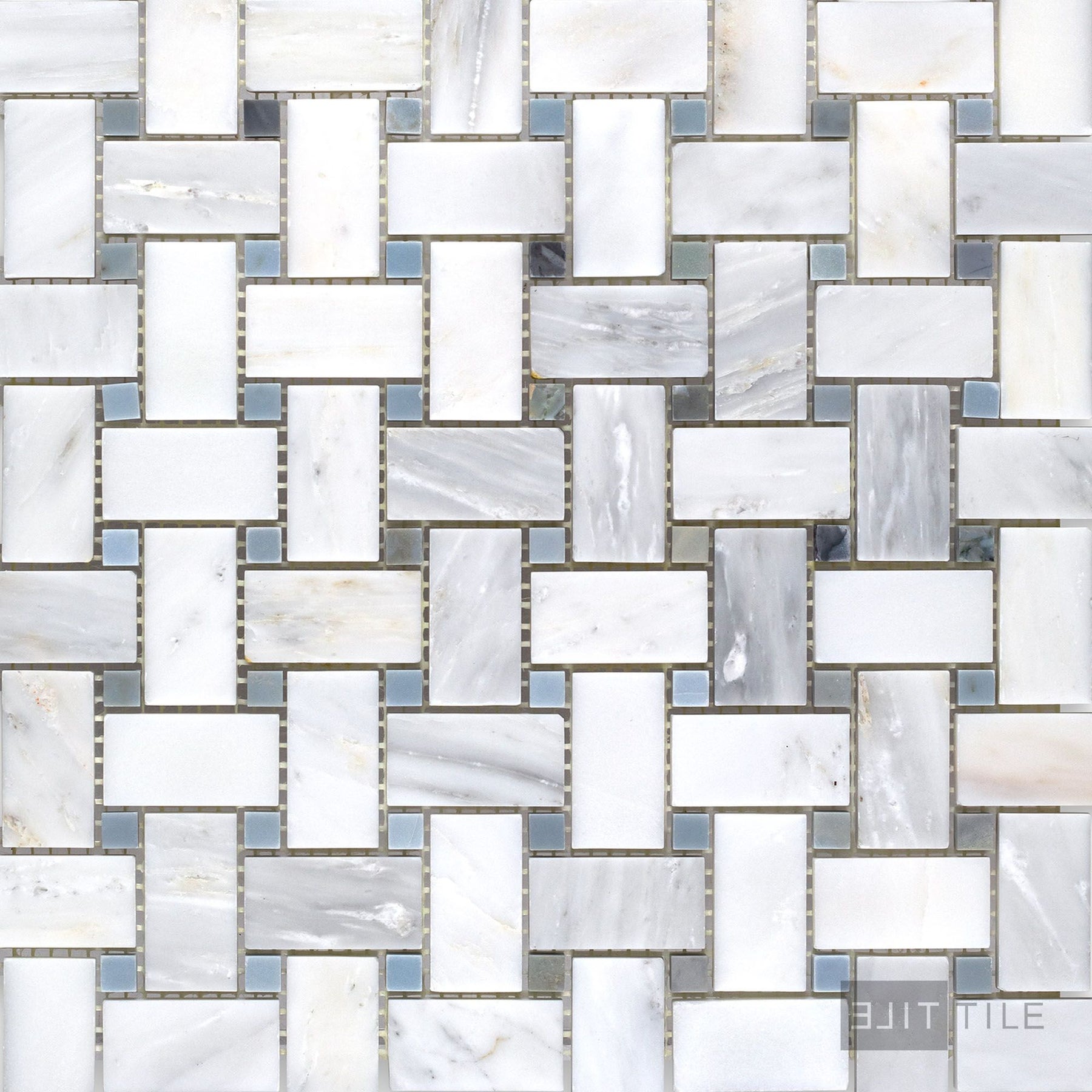 Oriental White Marble Basketweave W/ Blue Dot Honed Mosaic