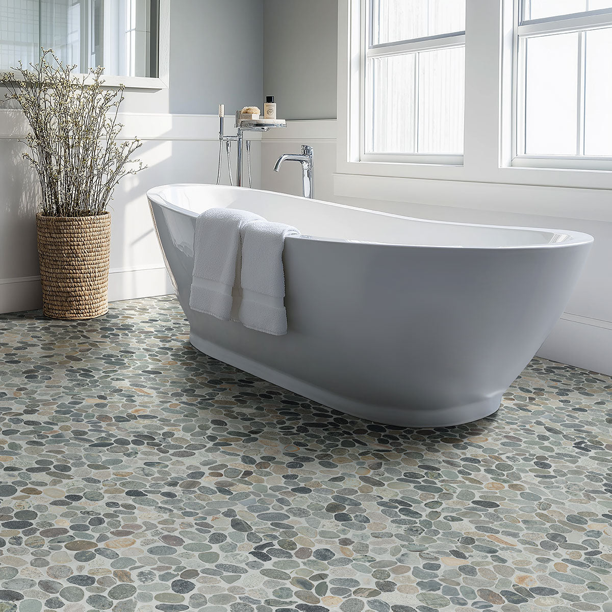Rio Lago Pebble Mosaic collection features natural marble, travertine, and limestone pebbles in a variety of colors, textures, and finishes—tumbled, polished, and honed. From subtle neutrals to bold contrasts, these mosaics bring organic charm and lasting style to floors, accent walls, showers, backsplashes, and even fireplace surrounds. Ideal for both indoor and outdoor spaces, the Rio Lago collection adds warmth, texture, and a touch of nature to any design.