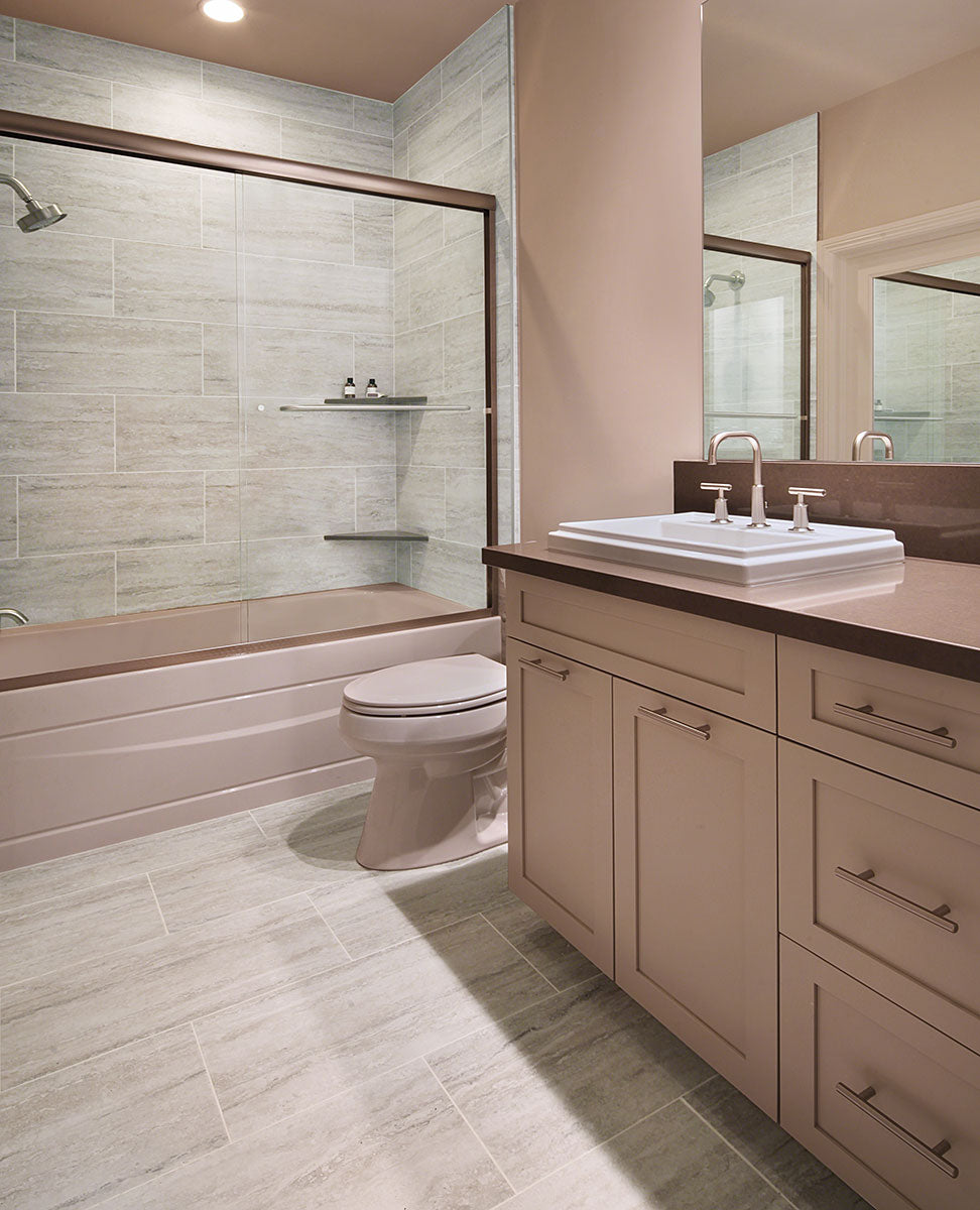Veneto collection offers a modern take on vein-cut travertine with luxurious linear movement and a range of stunning colors. Available in popular tile sizes including planks, rectangles, and coordinating bullnose, this high-quality porcelain allows for seamless floor and wall designs. Ideal for creating elegant, sophisticated interiors, Veneto combines timeless style with the durability and low maintenance of porcelain.