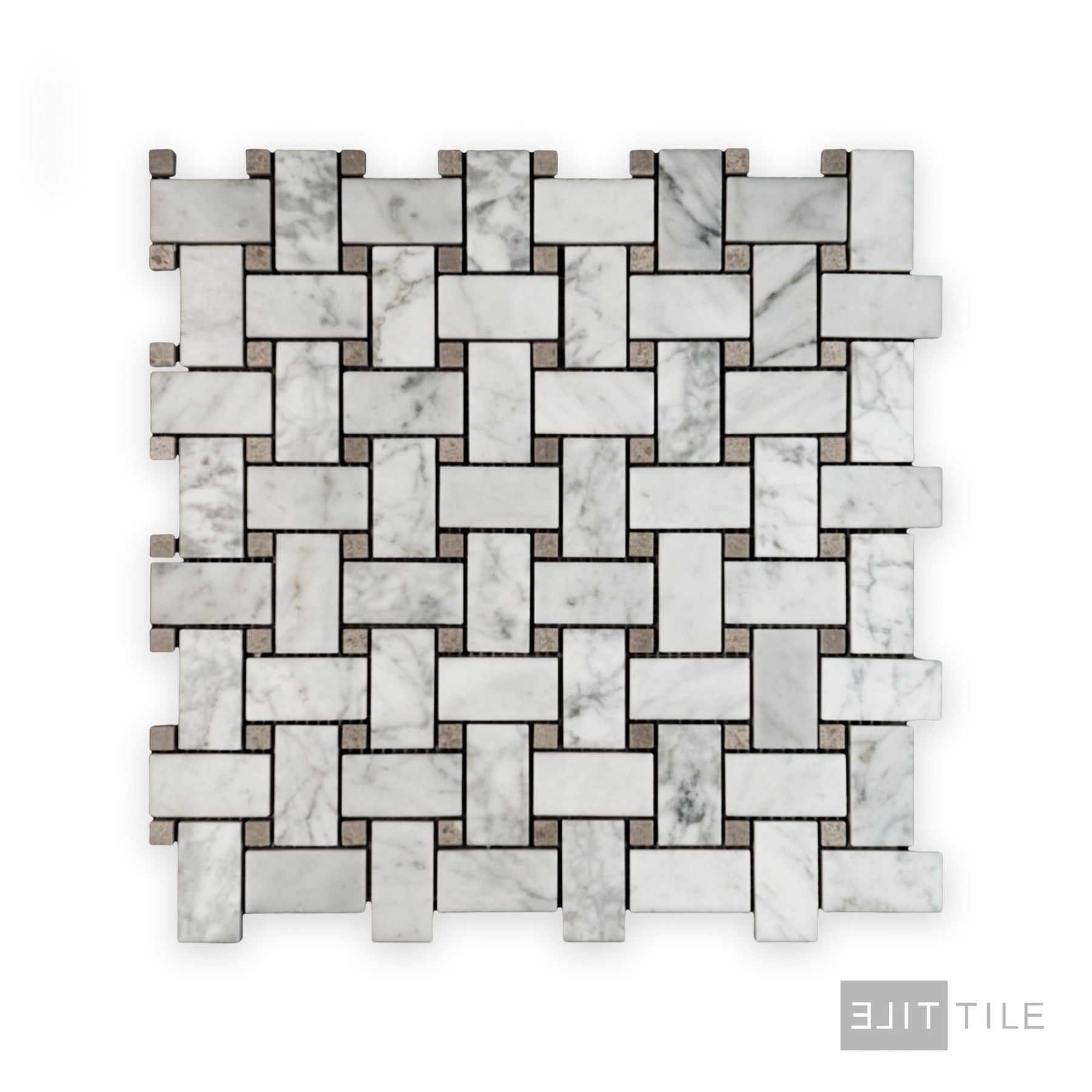 White Carrara Marble Basketweave W/ Grey Dot Polished Mosaic